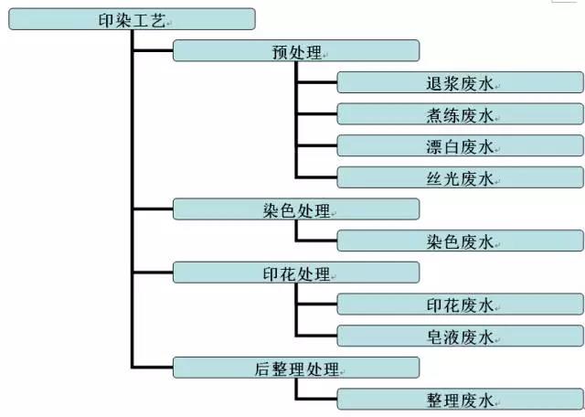 印染廢水不單單產生于染色過程中,印染過程分多個工序,每一道工序都要排出廢水,預處理階段(包括燒毛、退漿、煮煉、漂白、絲光等工序)要排出退漿廢水、煮煉廢水、漂白廢水和絲光廢水,染色工序排出染色廢水,印花工序排出印花廢水和皂液廢水,整理工序則排出整理廢水。