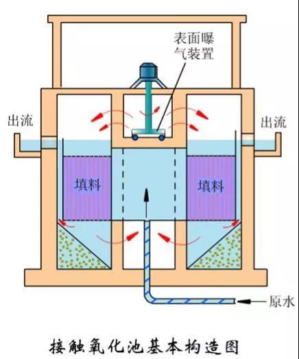 生物接觸氧化池停留時間一般為T=8~10小時,COD去除率約55%~60%,色度去除率約50%,氣水比一般為(10~12):1。生物接觸氧化池通常設計為2~3段。