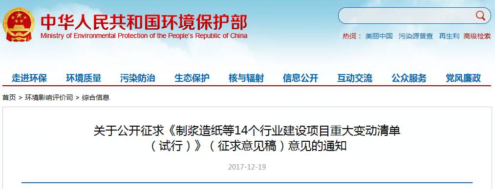 為進(jìn)一步做好起草工作,現(xiàn)公開征集對《制漿造紙等14個(gè)行業(yè)重大變動(dòng)清單(試行)》(征求意見稿,見附件)的修改意見。各機(jī)關(guān)團(tuán)體、企事業(yè)單位和個(gè)人可向我部提出意見和建議。征集意見截止時(shí)間為2018年1月3日。