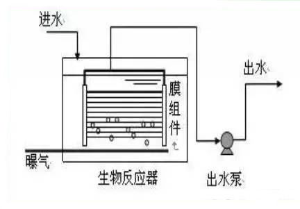 如圖1,把膜組件置于生物反應(yīng)器內(nèi)部。進(jìn)水進(jìn)入膜--生物反應(yīng)器,其中的大部分污染物被混合液中的活性污泥去除,再在外壓式作用下由膜過(guò)濾出水。這種形式的膜--生物反應(yīng)器由于省去了混合液循環(huán)系統(tǒng),并且靠抽吸出水,能耗相對(duì)較低;占地較分置式更為緊湊,近年來(lái)在水處理領(lǐng)域受到了特別關(guān)注。但是一般膜通量相對(duì)較低,容易發(fā)生膜污染,膜污染后不容易清洗和更換。