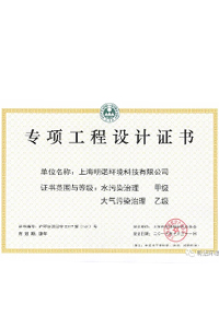 明諾環(huán)境獲得了一系列環(huán)保領(lǐng)域資質(zhì)證書,包括環(huán)境工程設(shè)計(jì)專項(xiàng)(水污染防治工程)乙級證書、環(huán)保工程專業(yè)承包三級證書、環(huán)境污染治理工程總承包資質(zhì)證書、專項(xiàng)工程設(shè)計(jì)證書水污染治理甲級、大氣污染治理乙級證書和污染治理設(shè)施運(yùn)行服務(wù)能力評價(jià)證書,同時成為上海市環(huán)境保護(hù)產(chǎn)業(yè)協(xié)會會員單位。