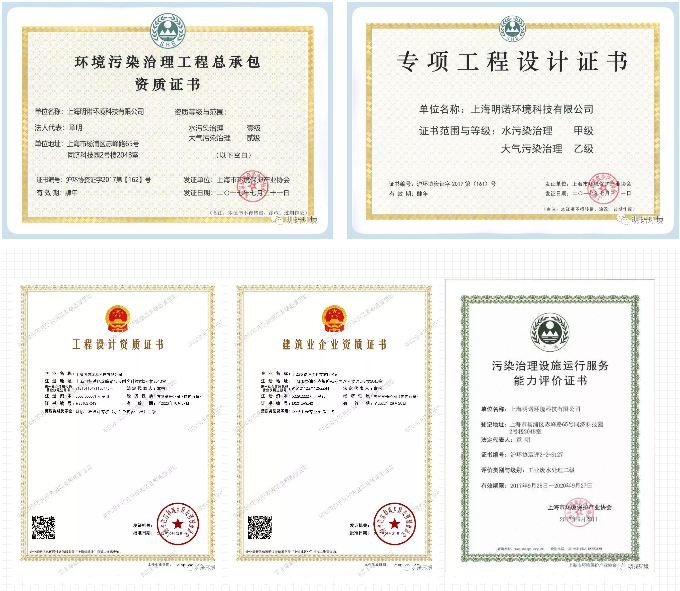 通過不懈努力明諾環(huán)境獲得了一系列環(huán)保領(lǐng)域資質(zhì)證書,包括環(huán)境工程設(shè)計專項(水污染防治工程)乙級證書、環(huán)保工程專業(yè)承包三級證書、環(huán)境污染治理工程總承包資質(zhì)證書、專項工程設(shè)計證書水污染治理甲級、大氣污染治理乙級證書和污染治理設(shè)施運行服務(wù)能力評價證書,同時成為上海市環(huán)境保護產(chǎn)業(yè)協(xié)會會員單位。
