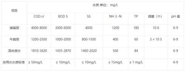 以山西省某市要新建一座豬、牛養(yǎng)殖場為例,該養(yǎng)殖場規(guī)模為:年養(yǎng)豬3000頭,養(yǎng)牛2000頭。廢水水量為1500m3/d,水質(zhì)見下表,處理水要求達(dá)到《雜用水水質(zhì)標(biāo)準(zhǔn)》(CJ 25.1-89)。