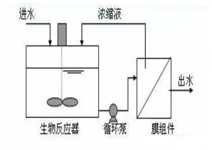 如圖2,把膜組件和生物反應(yīng)器分開(kāi)設(shè)置。生物反應(yīng)器中的混合液經(jīng)循環(huán)泵增壓后打至膜組件的過(guò)濾端,在壓力作用下混合液中的液體透過(guò)膜,成為系統(tǒng)處理水;固形物,大分子物質(zhì)等則被膜截留,隨濃縮液回流到生物反應(yīng)器內(nèi)。